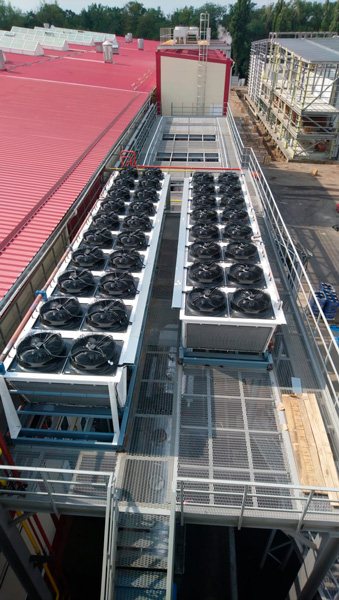 Для фризеров изготовлен холодильный агрегат на двух винтовых полугерметичных компрессорах. Агрегат укомплектован 16-вентиляторным конденсатором с адиабатической системой охлаждения высокого давления и системой водоподготовки с обратным осмосом. Для повышения его энергоэффективности использованы экономайзеры, а также всасывающий коллектор-отделитель жидкости с теплообменником-переохладителем запатентованной нами конструкции.