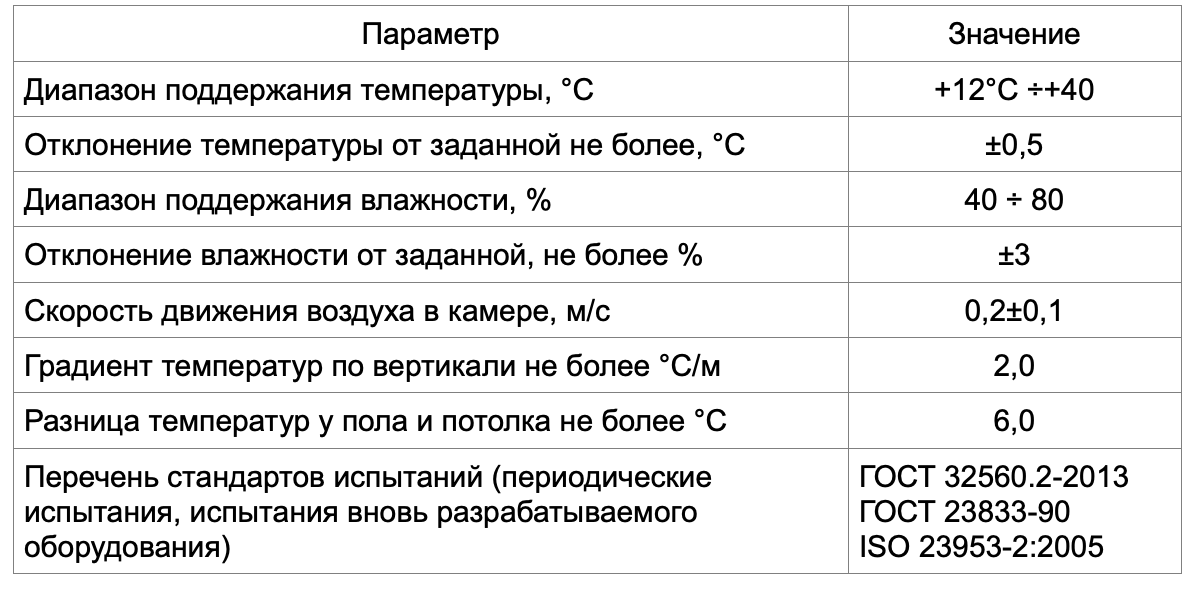 Скорость движения воздуха в камере, м/с | 0,2 ±0,1 |