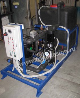 - Исполнение холодильной машины с гиромодулем на общей раме. низкотемпературной Гидромодуль в составе: жидкостной насос (один или более), емкость для жидкости, арматура, автоматика, трубопроводы с теплоизоляцией, рама и щит управления .