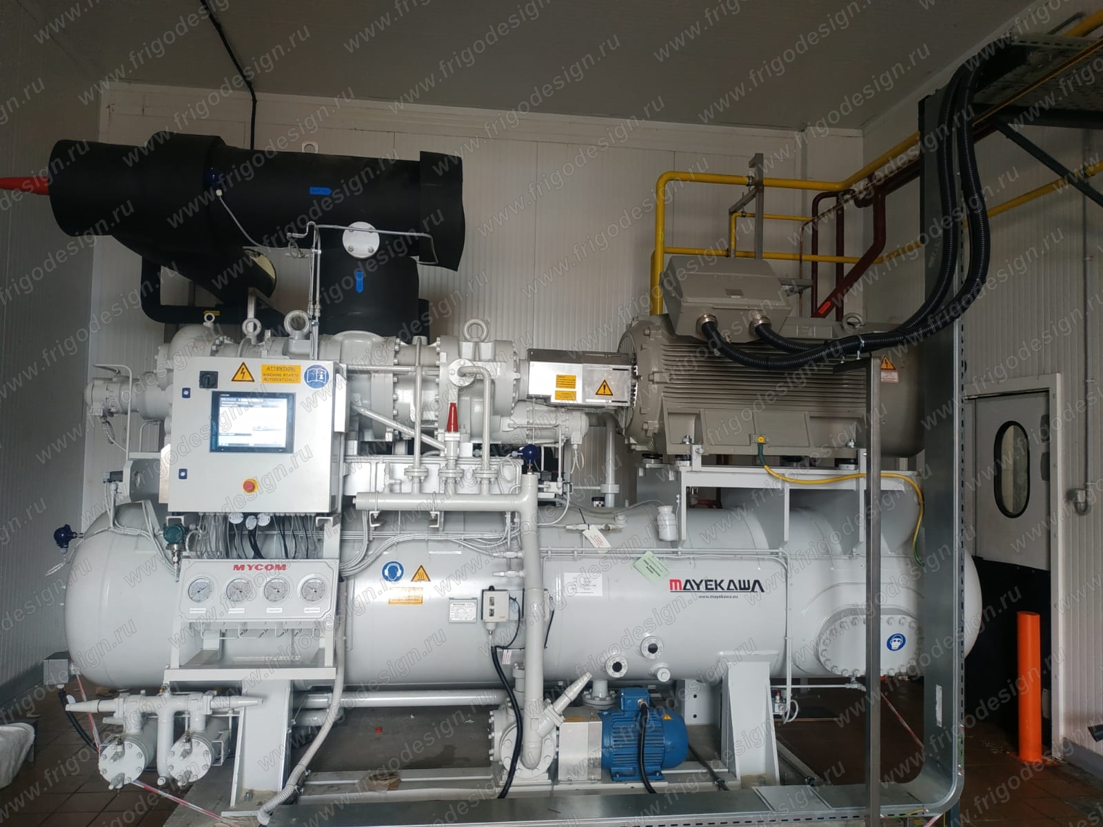 Компрессорный агрегат установки холодоснабжения фризеров на производстве Фриготрейд и после монтажа у заказчика.
